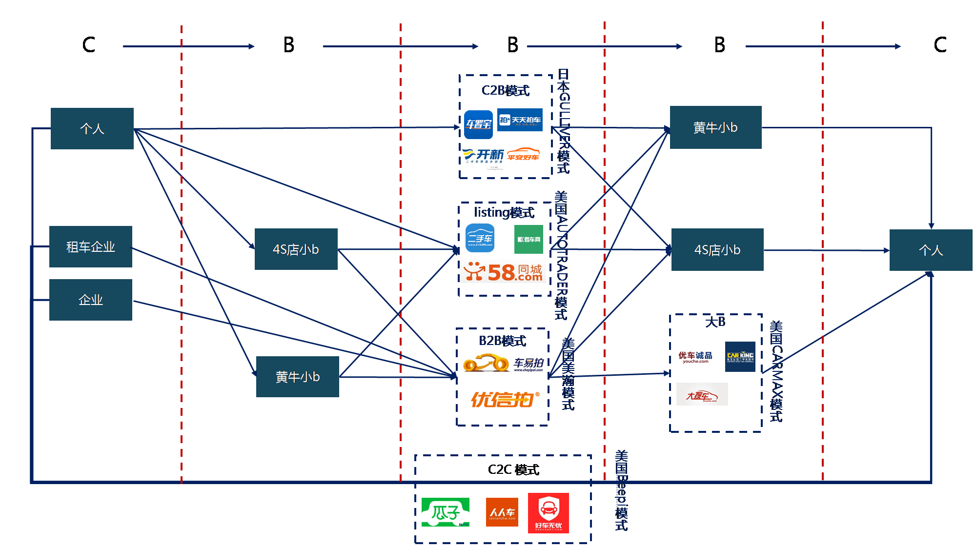 耐用消费品(房车)刚刚起步: 二手耐用消费品的突然爆发把整个行业从广告时代带进了交易时代,这个更多是宏观经济决定的,当然用户基数到了也是一个很大的原因。我们对需求的判断是耐用消费品是理性消费,即使趋势有利,需求的释放也是渐进的。目前看,互联网在耐用消费品电商里发挥的作用还不是那么大,原因是市场初起消费者还很迷茫,因此需要中介的介入来完成第一次卖房或者第一次卖车这样的体验。以二手车为例,传统的C2B2B2B2C链条在买车者和卖车者两边都安插了小b(或称黄牛),这些小b提供了资金周转/库存,整备,评估,过户和咨询等一系列服务,号称要跳过中间的三个B的所谓C2C模式,实际是把中间的三个B自己做了而已,那么把这些服务集约化的C2C模式,是否比把这些服务分散化的C2B, B2B和Listing (B2B2C)模式更有优越性呢? 做得好就是京东,做不好就是淘宝,两个模式投入不同,可以并行。小B服务商和生鲜产地一样,其实做了一件把非标准化的产品重新标准化一次以备流通的事。这件事集约化是否有价值,我们持怀疑态度。