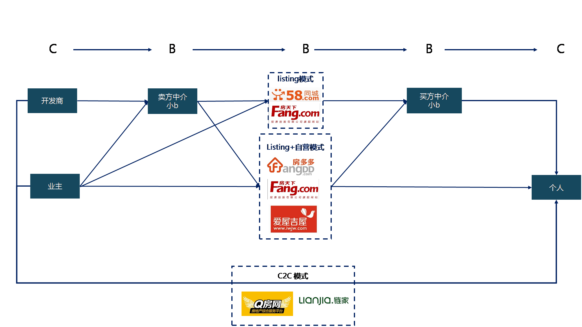 车可以流通,房不能流通,应用到二手房,小b就是房产中介。中间的三个B就有机会合在一起成为C2B2C,也有机会和成C2B2b2C(大B分发给小b),线下的门店除了把非标准化的房源信息转化为标准化的可流通信息以外,还起到一个关键的广告的作用,这个广告既可以给买家看,也可以给卖家看,这个广告因为贴近交易场景和24x7曝光性价比可能还很高,因为这三个原因(两面性,交易场景和24x7曝光)我们怀疑比互联网广告性价比还高。这个房源的整备步骤在成熟市场可以遵循一套自动标准化的流程,削弱中介存在的价值,但是我们认为没有一个全国性的规模经济,任何模式创新都会归结到谁比谁融资融得多的比拼中去,在一个熊市里越激进的模式越容易灭绝。