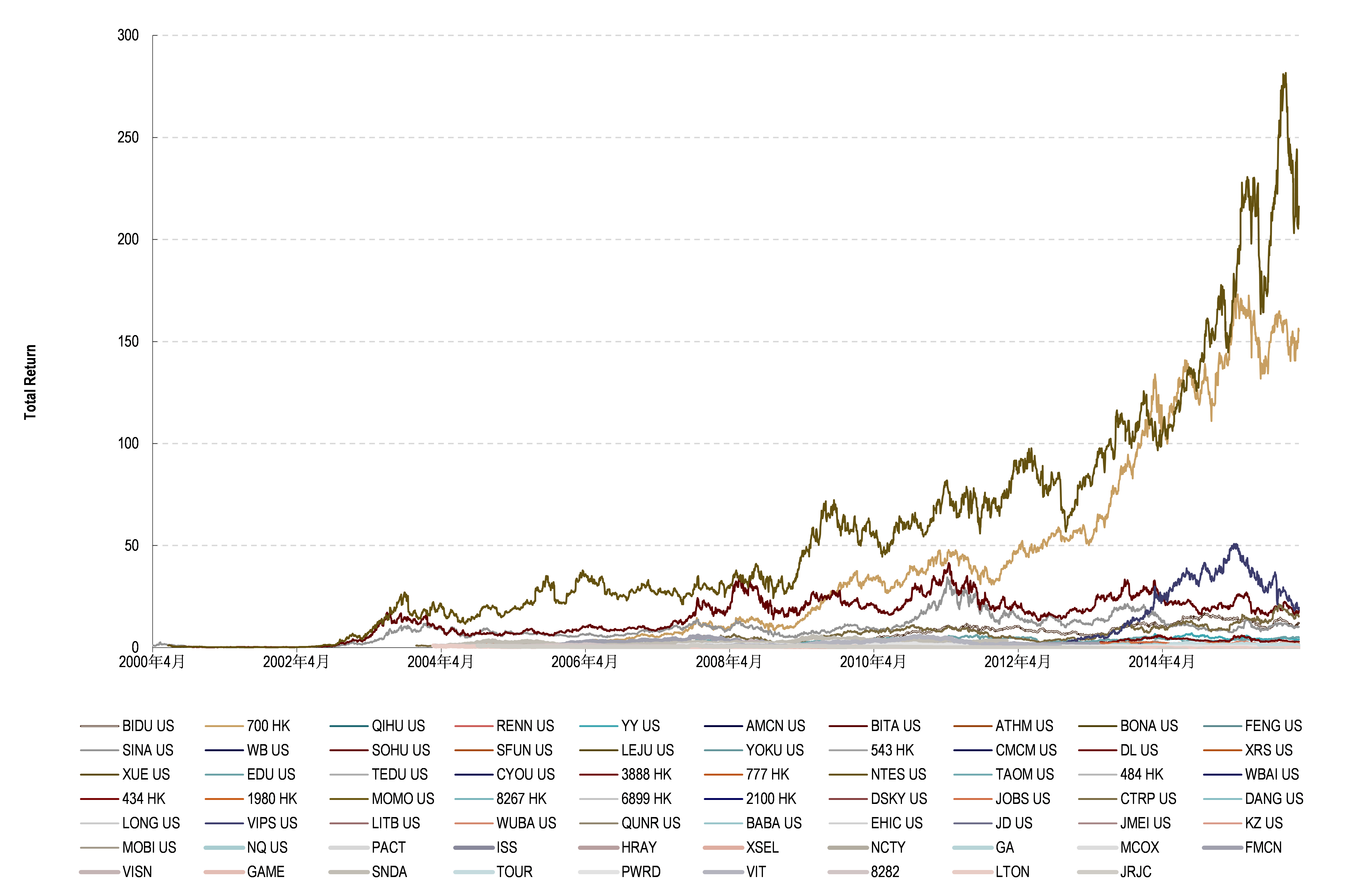 上次专栏我们提到,中概股上市后能经久不衰的比例大概在20%左右,其余的成了僵尸股,被并购或者退市了。这个20%的依据是我们几年前做的一个小范围的数据整理。这次,我们把中概股BLRI 指数的70家上市公司(包括已退市)自上市以来的回报做了一个分析,看看多少家给予投资者超过指数的回报。这70家公司的股价回报如下图。