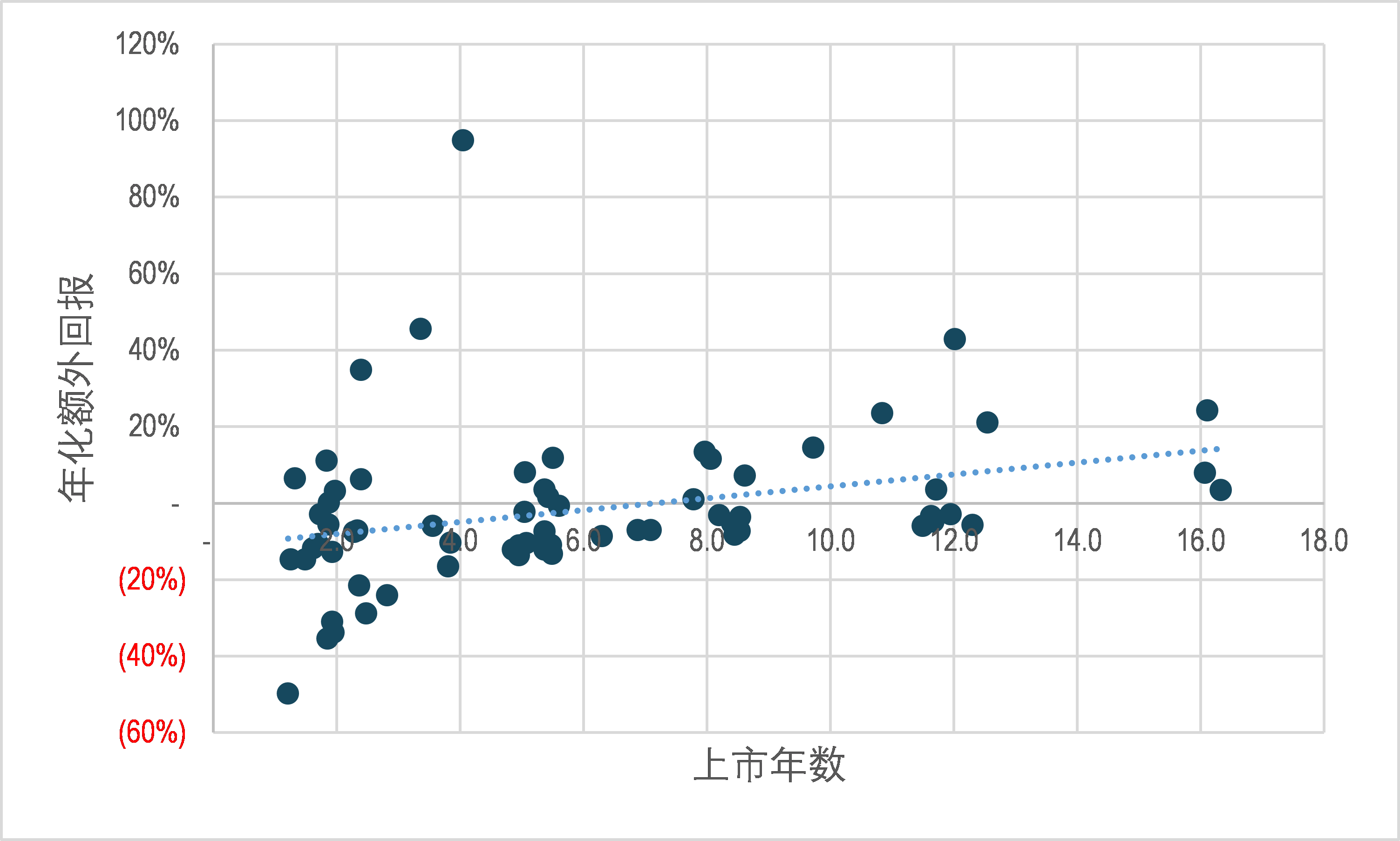 我们把年化收益和上市年数做一个比较,发现并无相关性。甚至年数越长回报越好。这我们认为是受目前熊市的影响。